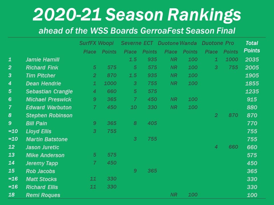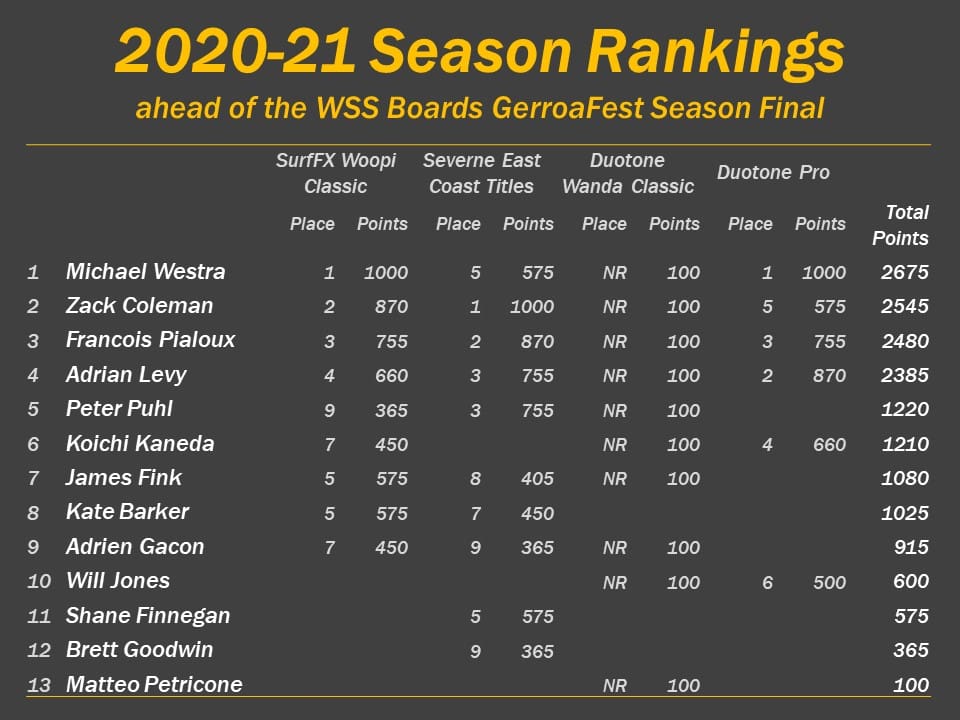 Both the open and master division season titles will be up for grabs at the season-ending WSS Boards GerroaFest. A no-result event at Wanda means all sailors will effectively be forced to make it their dropped event, meaning the results of the season final will count for all sailors.