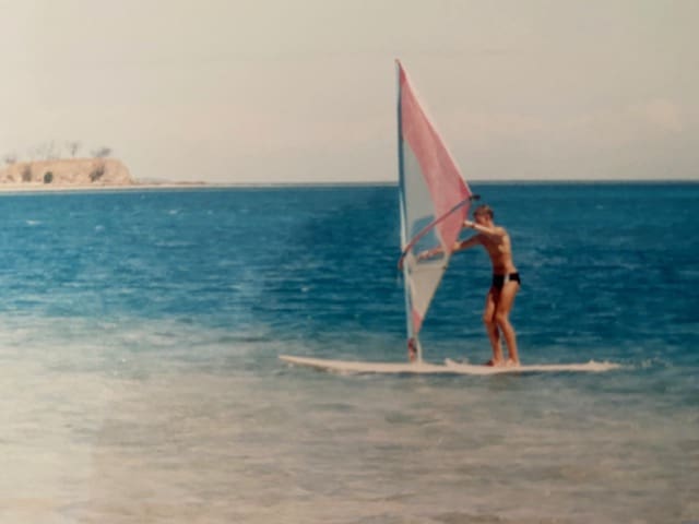 I vividly remember the feeling. I was 12, and we were staying on Malolo Island in Fiji back in the ’80s. There was a large board and a small sail on the beach, free for guests at the resort. I recall pestering the watercraft attendant to let me take it out for a go. He persistently asked, “Can you swim, boy?” Luckily for me, I was a skilled swimmer at that age, with ribbons and medals back home in the “pool room.” I might have even been a little cocky and challenged the tall Fijian to a race. After much convincing, I dragged that big board and sail into the warm pacific waters.