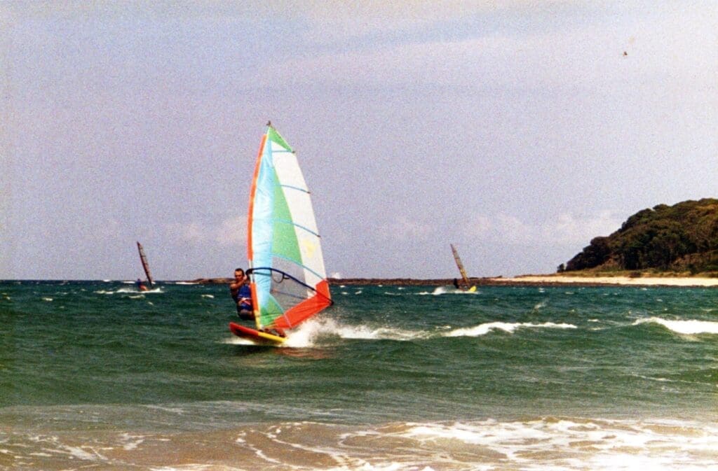 When I returned home to Broulee, I nagged, worked, saved, and pooled enough money to visit our local windsurf shop in Mogo, “Southwind,” owned and operated by Kel Wehner. Some may recognise the name from Shane Wehner, who came second in the Pipe Masters in 1999. Kel was a local board shaper who also shaped windsurfers. He set me up with gear within my budget—a big fibreglass windsurfer with foot straps everywhere, a couple of wave sails, and a fibreglass mast with splinters to boot. From that moment, I was hooked, blasting up and down North Broulee, slowly building confidence, chop jumping, water starting, and learning to gybe.